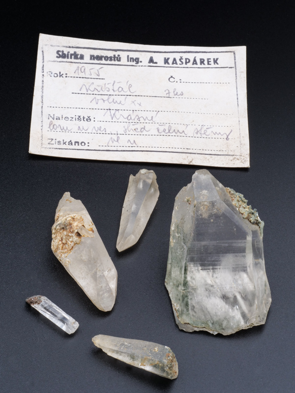 5 ks krystalů křišťálu s chloritem ve spodní části z lokality Krásné u Šumperka.5 ks krystalů křišťálu s chloritem ve spodní části z lokality Krásné u Šumperka. Kameny nesou drobné známky poškození (některé v ukončení, některé na hranách). Přesto kameny v této kvalitě z domácí lokality považujeme za pěkné vzorky. Sběr v roce 1955 !!! Etiketa původního majitele součástí. Váha největšího kamene je 36,7 g, velikost největšího kamene 5,3x3,4x2,0 cm.