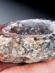Peříčkový achát z Brazílie. Leštěné či jinak upravené kameny nenabízíme příliš často. Zde nás přesvědčila nejen krása a kvalita vzorku (na peříčkový achát je velikost nadprůměrná), ale především přítomnost kalcitovokřemenné pseudomorfózy uvnitř geody.