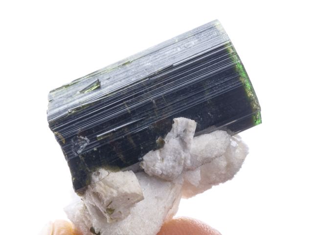 Samostatný krystal verdelitu na drobné a jemné podložce z albitu. Jedná se o rovně ukončený lesklý krystal ve kterém se barevné zóny střídají od zelené až po tmavě černou (ta převládá), která se vyskytuje hlavně ve spodní části krystalu. Pro prosvícení je nutný zdroj světla.