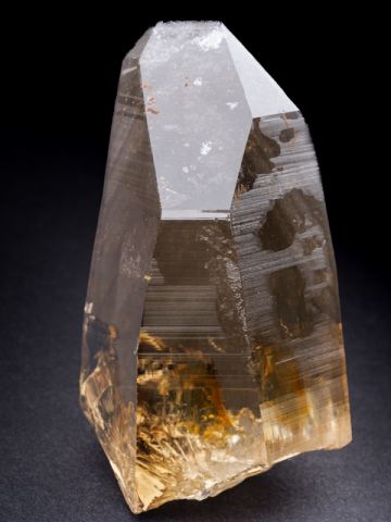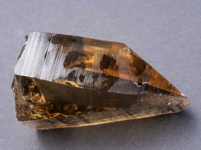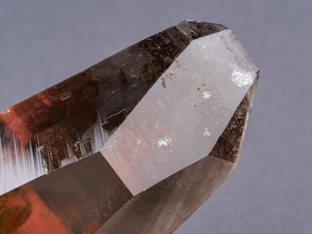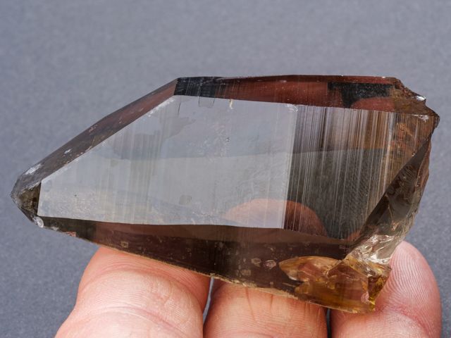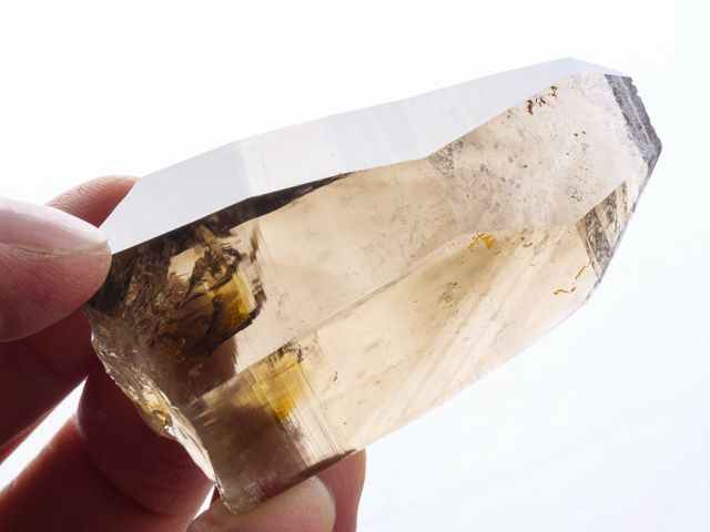 Zajímavý krystal přírodní záhnědy z ruské lokality Južnyj. Krystal je ukončený, lesklý a má přirozenou příjemně světle kouřovou barvu. Vysoká čistota dovoluje podobný materiál brousit - velká partie (99%) je drahokamová tzv. optický křemen - zde by to ale bylo velmi škoda jakkoliv s kamenem pracovat.