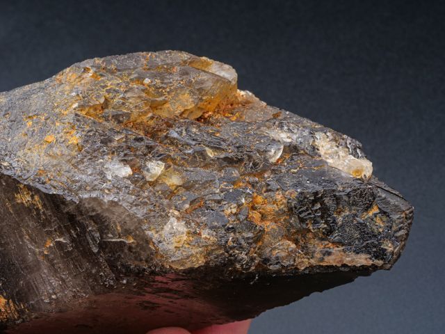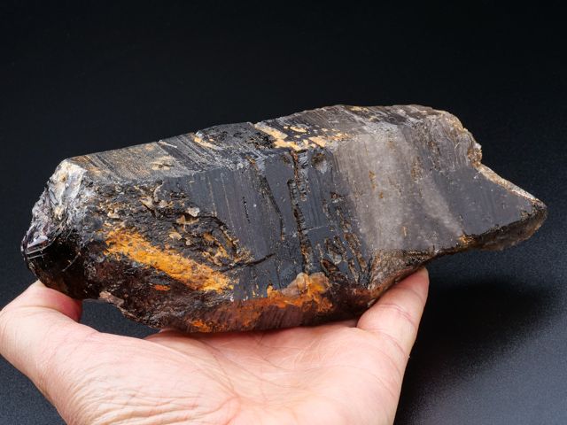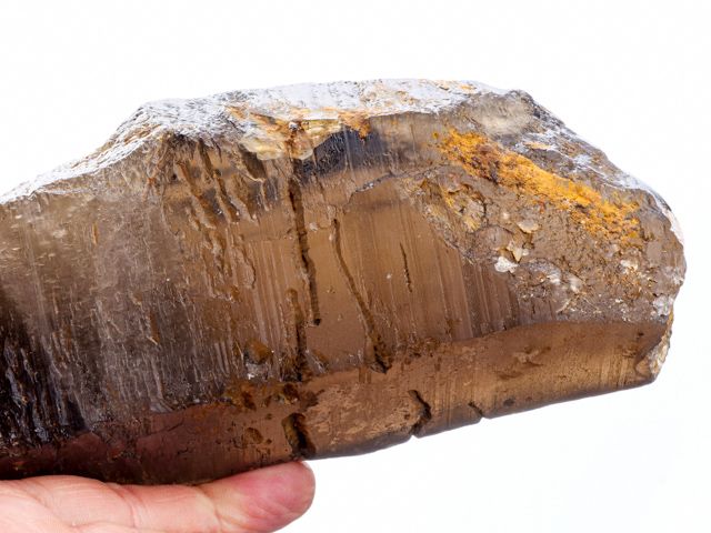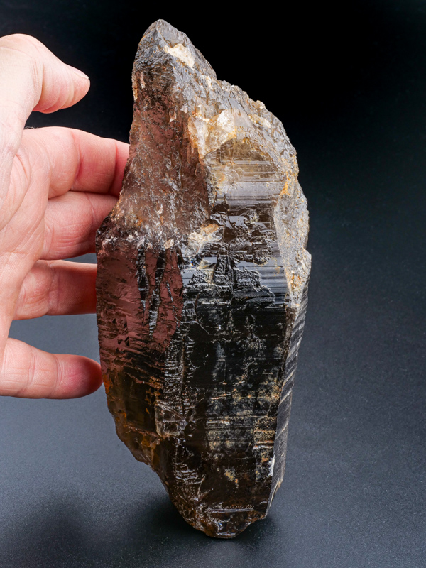 Krásný částečně ukončený krystal záhnědy - kámen z lokality Krásněves. Krystal je 15,6 cm velký, lesklý a při prosvícení naprosto čistý (ve 2/3 objemu). Krystal je vlastně spodní částí krystalu - čistota a tvar vzorku předurčuje kámen pro vytvoření opravdu velkého brusu.