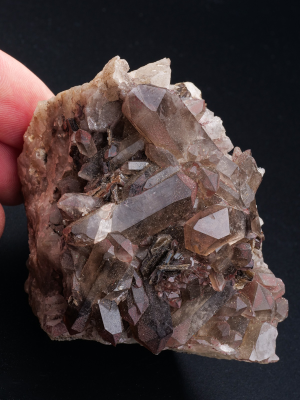 Pěkný vzorek záhněd na podložce s cinvalditem z fenomenální lokality Cínovec.Pěkný vzorek záhněd na podložce s cinvalditem z fenomenální lokality Cínovec. Největší krystal záhnědy je 3,8 cm velký. Záhnědy jsou velmi čisté. Sběr cca 1965 - původní etiketa součástí položky.