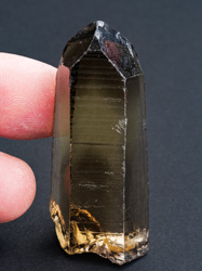 Velký lesklý krystal záhnědy s hojnými inkluzemi jemných vláskovitých xx sagenitu zlatavé barvy.Velký lesklý krystal záhnědy s hojnými inkluzemi jemných vláskovitých xx sagenitu zlatavé barvy. Nerost sagenit resp. rutil je jednou ze tří v přírodě se vyskytujících modifikací oxidu titaničitého. Krystal záhnědy má mírně setřelé ukončení a jednu hranu prizmatu. Vzhledem k celkové kvalitě kamene se však jedná o bezvýznamné poškození.