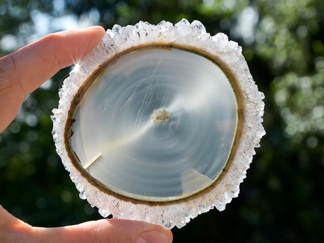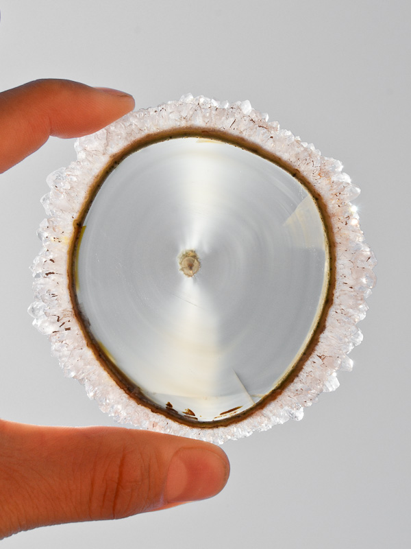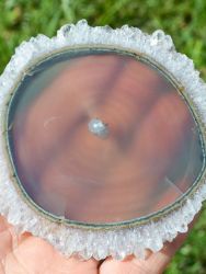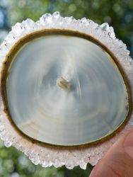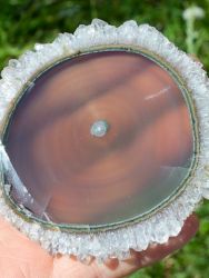 Řez ametystovým / achátovým krápníkem z Uruquaye. Jedná se o oboustranně leštěný plátek 6 mm tlustý. Krystaly po stranách jsou o velikosti do 8 mm.