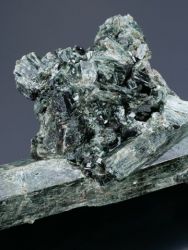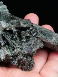 Tmavě zelené krystaly aktinolitu na podložce. Největší krystal měří 8 cm. Absolutní novinka na trhu. Tyto unikání krystaly aktinolitů byly nalezeny roku 2023. V porovnání se světovými lokalitami aktinolitů, kde se aktinolit vyskytuje v podobě velmi malých krystalů či vláknitých krystalů milimetrových rozměrů, zde se jedná o největší krystaly co byly kdy nalezeny. Jedná se o aktinolit z alpské parageneze, který tvoří ukončené extrémně velké krystaly. Vyjímečně mohou srůstat do dvojčatého srůstu. Vyskytují se v asociaci nejen s křemenem, ale i s granátem, scheelitem, magnetitem a spoustou dalších vzácných minerálů. Při prosvícení silným světlem mají kameny výraznou zelenou drahokamovou barvu.