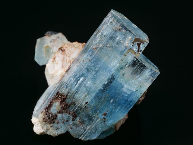 Translucent-to-transparent aquamarine crystal on matrix, the blue-green gem variety of beryl.Translucent-to-transparent aquamarine crystal on matrix, the blue-green gem variety of beryl. The color of Erongo aquamarine crystals is very blue, with no yellow tint.