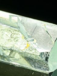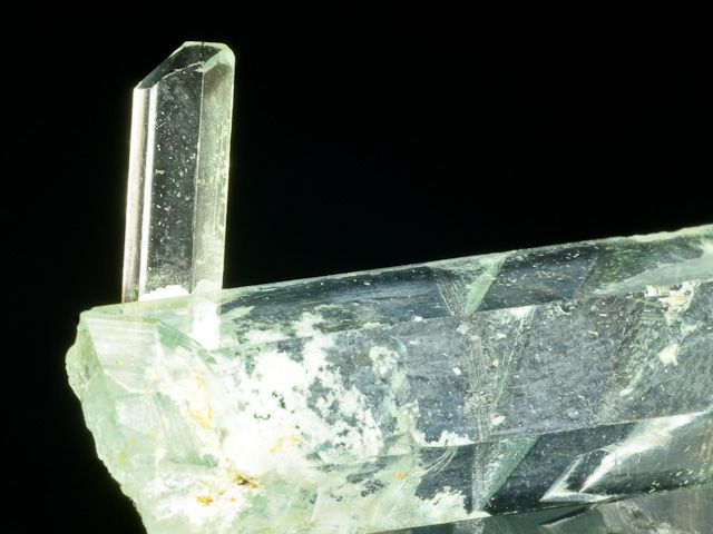 Exkluzivní modrý krystal akvamarínu z mongolské lokality Hutag Ull Ord. Krystal je lesklý a ve vrchní části krystalu gemmy kvality. Na bázi krystalu narůstá menší 1,4 cm velký ukončený krystal akvamarínu. Krystal je ukončený s kontaktem těsně pod ukončením.