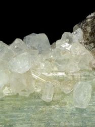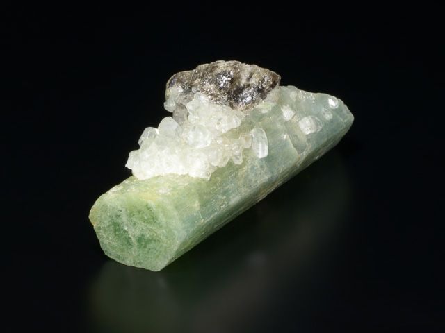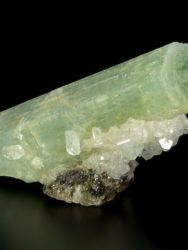 Super blue gem crystal of aquamarine (89 mm) on a quartz and topaz matrix.Super blue gem crystal of aquamarine (89 mm) on a quartz and topaz matrix. Many topaz crystals are attached to a matrix of smoky quartz and aqua. The composition of bright aquamarine against slightly duller dark quartz is really good. No damage. Interesting material from Russia.