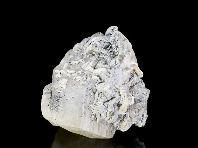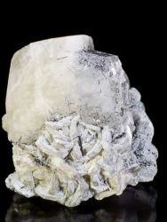 Velký krystal albitu ve spojení s krystaly turmalínu a lepidolitu z ceněné lokality v Tádžikistánu.Exkluzivní vzorek - velký krystal albitu ve spojení s drobnými krystaly turmalínu a lepidolitu zarostlými do základní podložky z ceněné lokality v Tádžikistánu. Krystal albitu měří 7,7 cm napříč, je velice lesklý a relativně čistý se světle nažloutlou barvou. Krystaly turmalínu tmavou barvu. Kvalitativně i lokalitně lze tento kámen zařadit na nejvyšší příčky.
