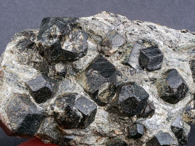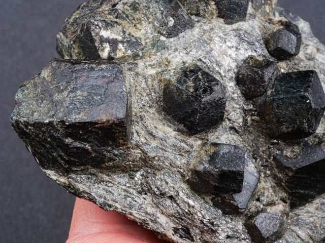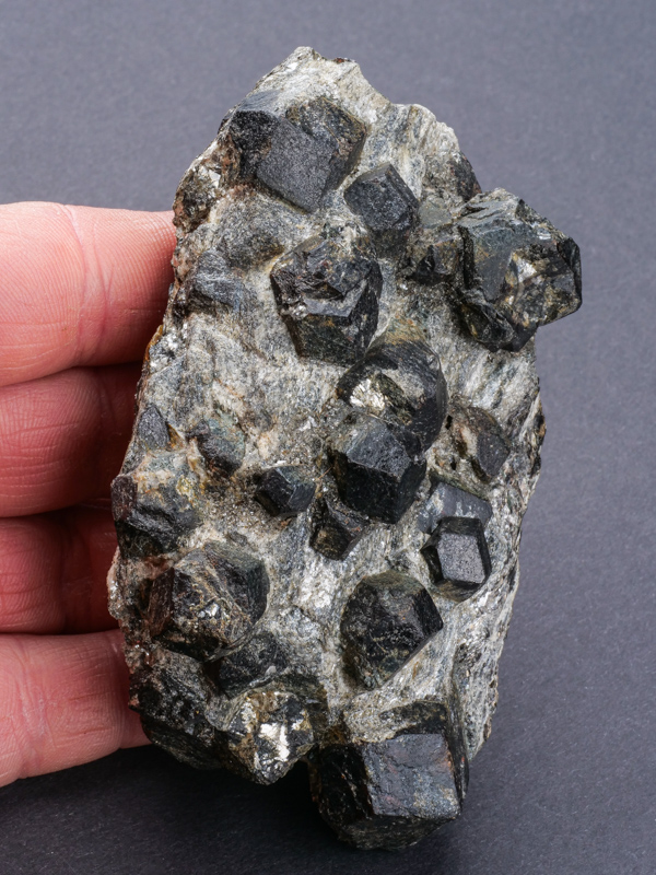 An old-time specimen of sharp, lustrous, deep blood-red almandine garnet crystals to 2.3 cm on biotite schist-covered matrix from Granatenkogel Mt., Austria.An old-time specimen of sharp, lustrous, deep blood-red almandine garnet crystals to 2.3 cm on biotite schist-covered matrix from Granatenkogel Mt., Austria. The specimen was extracted from solid rock, not from a cavity, resulting in minor surface imperfections where the surrounding matrix was removed.
