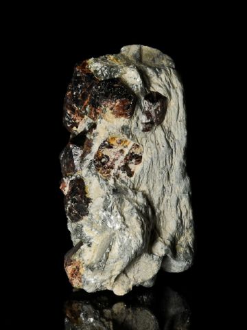 An old-time specimen of sharp, lustrous, deep blood-red almandine garnet crystals to 2.5 cm on schist-covered matrix from Verchnaja Sysert, Russia.An old-time specimen of sharp, lustrous, deep blood-red almandine garnet crystals to 2.5 cm on schist-covered matrix from Verchnaja Sysert, Russia. The specimen was extracted from solid rock, not from a cavity, resulting in minor surface imperfections where the surrounding matrix was removed.