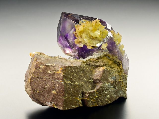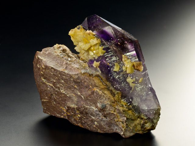 Srostlice krystalů ametystu sytě fialové barvy společně s krásnými krystaly dolomitu po bocích hlavních krystalů.Srostlice krystalů ametystu sytě fialové barvy společně s krásnými krystaly dolomitu po bocích hlavních krystalů. Vzorek má nepoškozená ukončení, výborný lesk a především výbornou kompozici. Hezký a velký zástupce africké lokality.