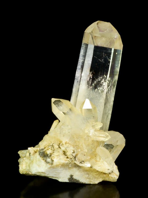 This is a clear light amethyst crystals on matrix from the Brandberg Mountain Region in Goboboseb, Namibia.This is a clear light amethyst crystals on matrix from the Brandberg Mountain Region in Goboboseb, Namibia. Aesthetic, undamaged, unrepaired matrix specimens are uncommon from this locality. This particular specimen is a very aesthetic cluster. Main crystals is 4,7 cm tall with impactful display quality.
