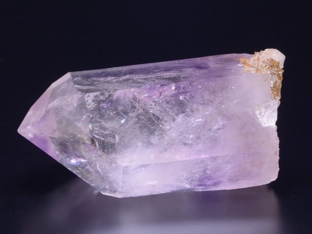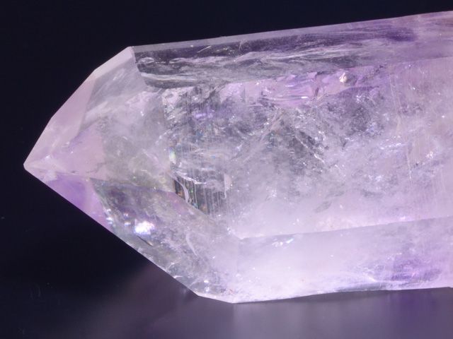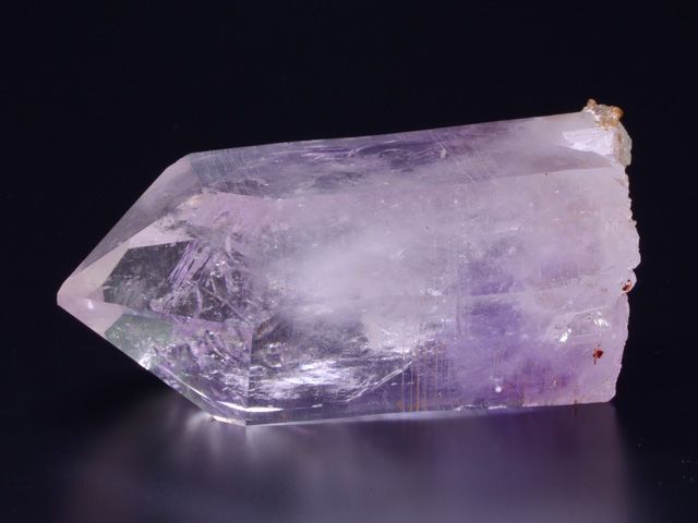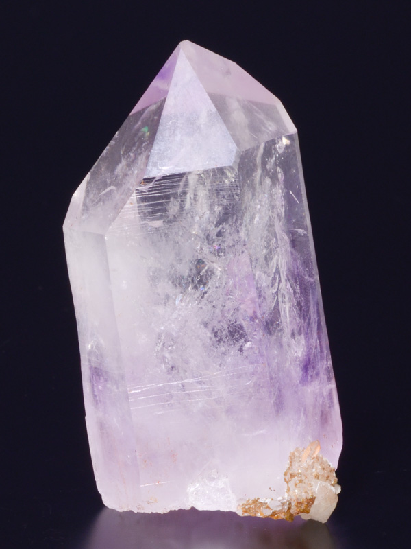 A striking, pristine, complete all-around, water-clear, light amethyst crystal with a fantastic, complex termination and dramatic, parallel inclusions.A striking, pristine, complete all-around, water-clear, light amethyst crystal with a fantastic, complex termination and dramatic, parallel inclusions. The light striations on the side faces are a beautiful accent. Each rotation of this crystal gives a fascinating, different view of the crystal faces and interior! Amethyst crystal with visible water bubbles (up to 1 mm).