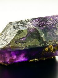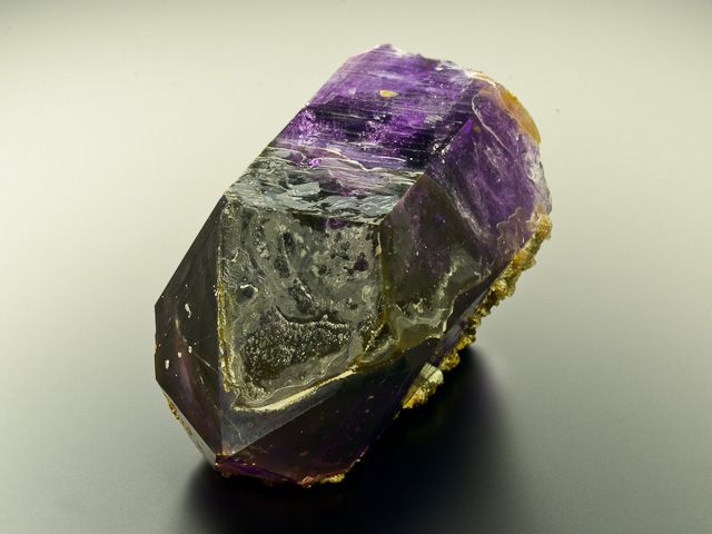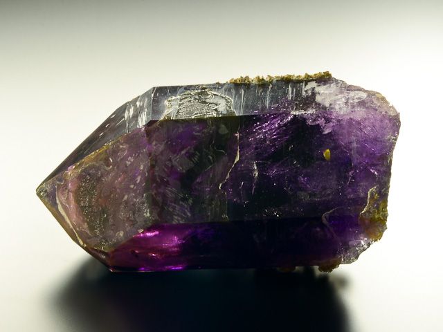 Krystal ametystu tmavě fialové barvy s dokonalým ukončením a úžasnou vnitřní strukturou.Krystal ametystu tmavě fialové barvy s dokonalým ukončením, úžasnou vnitřní strukturou a menší 1 mm velkou pohyblivou libelou v těle krystalu. Vzorek má extra tmavou a výraznou barvu, nepoškozené ukončení a zvláštní lesk. Ametyst je doplněn drobnými krystaly dolomitu na zadní straně.