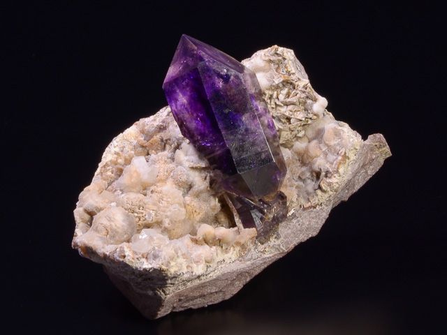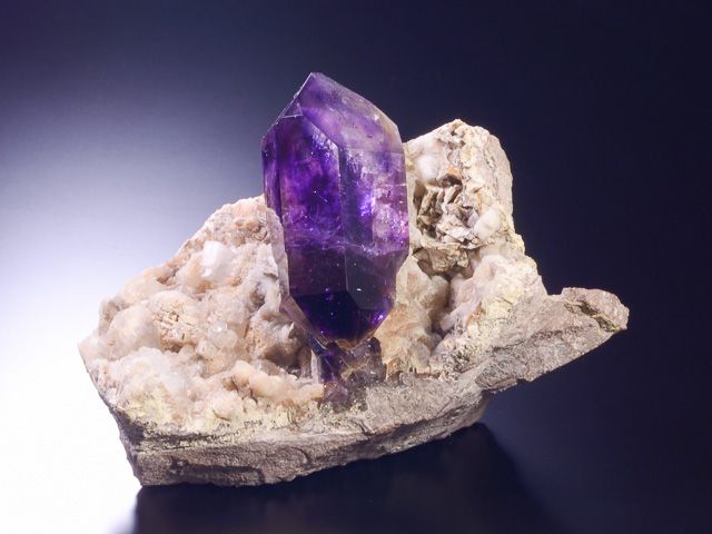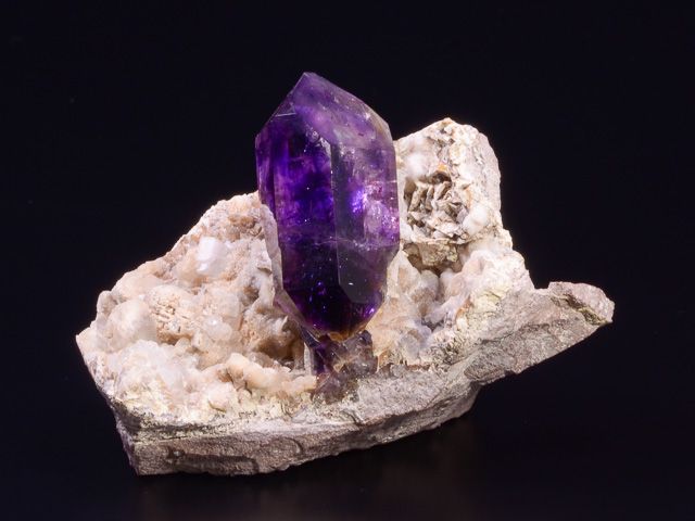 Žezlovitý krystal ametystu sytě fialové barvy společně s krásnými krystaly dolomitu po bocích hlavních krystalů.Žezlovitý krystal ametystu sytě fialové barvy společně s krásnými krystaly dolomitu po bocích hlavních krystalů. Vzorek má nepoškozené ukončení, výborný lesk a především výbornou kompozici. Hezký a velký zástupce africké lokality. Nově udělán pro lepší prezentaci podstavec na míru - tzn. součástí dodávky dostanete i podstavec, jehož výroba v nákladech vyšla na 120 EUR.