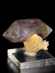 Srostlice krystalů ametystu světle fialové barvy a sněhobílých kalcitů. Vzorek má nepoškozené oboustranné ukončení hlavního krystalu, zajímavý lesk a především výbornou kompozici. Na podložce je řada krystalů kalcitu o velikosti do 1,2 cm. Hezký a velký zástupce africké lokality. V krystalu ametystu se pohybují drobné plynokapalné inkluze o velikosti největší bubliny 0,5 mm. Vzorek muzejních kvalit dodávaný na akrylovém podstavci.
