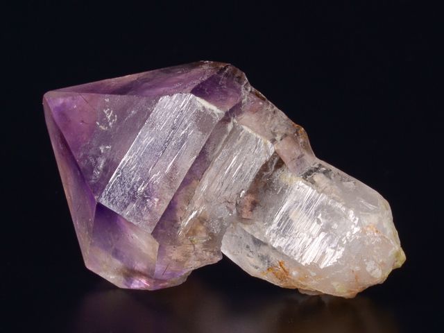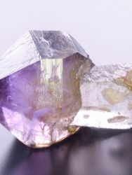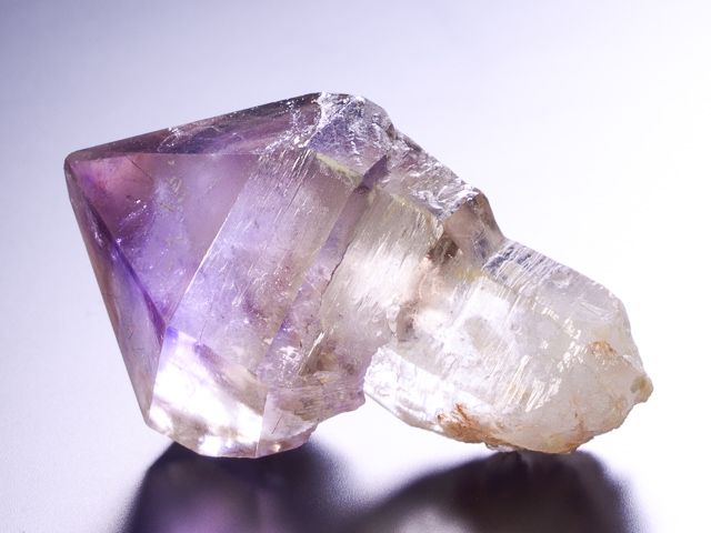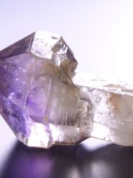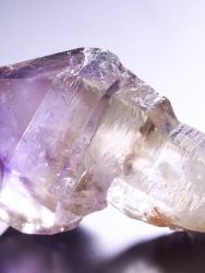 Skvělá ukázka žezlovitě rostlého ametystu z lokality Ambatomanoina. Z 2,1 cm velkého základního krystalu křišťálu vyrůstá 3,0 cm velký fialový krystal tvořící hlavu žezla. Lesklý vzorek bez poškození. Krystal obsahuje velmi drobrné inkluze rutilu.