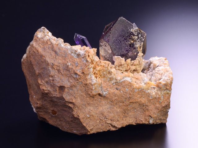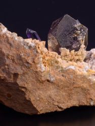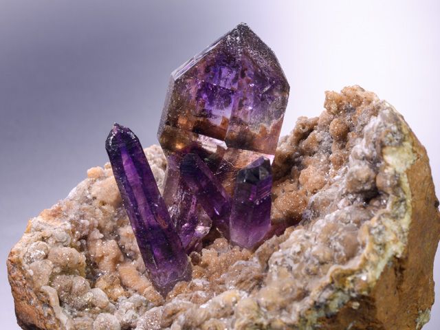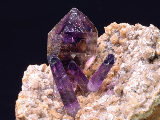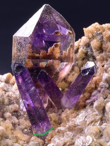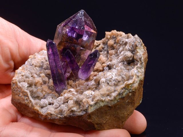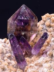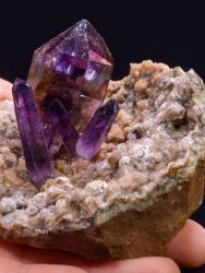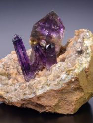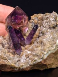 5 cm velký žezlovitý krystal ametystu tmavě fialové barvy - TOP vzorek z Namibie.5 cm velký žezlovitý krystal ametystu tmavě fialové barvy společně s 3 krásnými krystaly prizmatického ametystu a dolomitů na celé horní straně vzorku. Krystaly mají nepoškozená ukončení, výborný lesk a především výbornou kompozici. Nejdelší prizmatický krystal ametystu byl stabilizován v místě, které je označeno na jedné z fotografií. Luxusní a nadstandardní zástupce africké lokality.