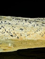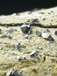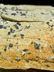 Anatase specimens from this well-known Russian locale are uncommon and are rarely available.Anatase specimens from this well-known Russian locale are uncommon and are rarely available. This showy and sculptural, upright is peppered with splendent to sparkly, textbook anatase crystals to 3.5 mm on the crest of the layered muscovite schist matrix.
