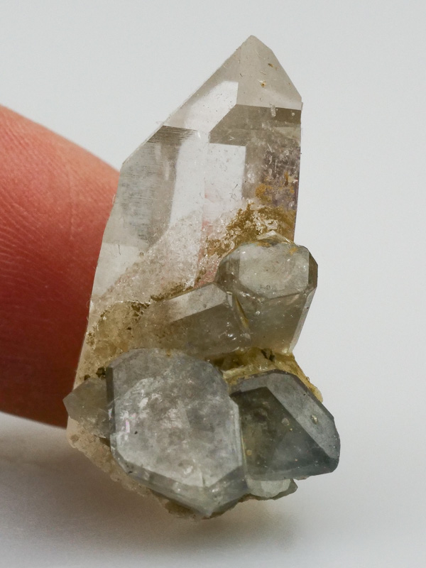 Well formed, translucent and lustrous crystals of apatite to 11 mm on quartz crystal, exhibiting distinct zoning.Well formed, translucent and lustrous crystals of apatite to 11 mm on quartz crystal, exhibiting distinct zoning. All crystals are complete.