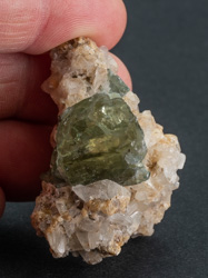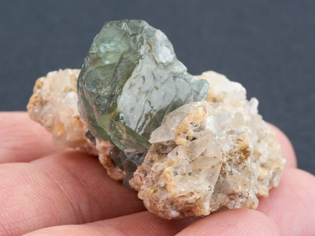 This glassy, translucent, pretty teal-blue apatite crystal sets in contrasting, lustrous, cream-colored calcite crystals are a Russian classic.This glassy, translucent, pretty teal-blue apatite crystal sets in contrasting, lustrous, cream-colored calcite crystals are a Russian classic. The main crystal is 2 cm and terminated and the apatite has a very distinctive melted look. Older and showy combination material.