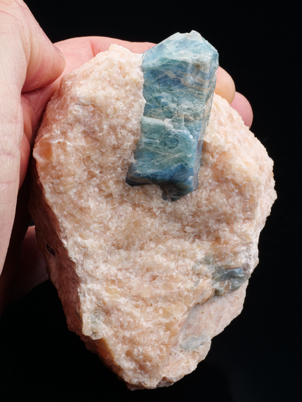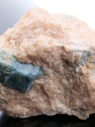 This glassy, translucent, pretty teal-blue apatite crystal sets in contrasting, lustrous, cream-colored calcite matrix is a Russian classic.This glassy, translucent, pretty teal-blue apatite crystal sets in contrasting, lustrous, cream-colored calcite matrix is a Russian classic. The main crystal is 4.6 cm terminated and the apatite has a very distinctive melted look. Older and showy combination material.