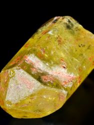 Velký samostatný ukončený krystal sytě žlutého apatitu z mexické lokality Cerro Mercado.Samostatný ukončený krystal sytě žlutého apatitu z mexické lokality Cerro Mercado. Krystal je lesklý, ukončený a poměrně velmi čistý. Jedná se o velký krystal s drobným poškozením hran (max. 3x2 mm) - toto je způsobeno způsobem těžby. Svojí kvalitou, velikostí a čistotou však představuje zajímavou volbu. Kámen je vhodný i k broušení.
