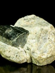 A crystal of Norwegian apatite attached to a euhedral crystal of arfvedsonite.A crystal of Norwegian apatite attached to a euhedral crystal of arfvedsonite. The apatite crystal is beige colored with slightly waxy luster. This is a wonderful locality piece.