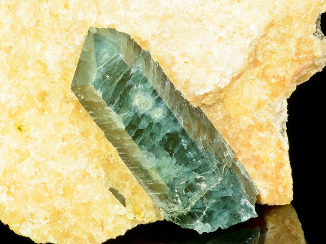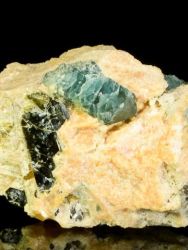 This glassy, translucent, pretty teal-blue apatite crystals set in contrasting, cream-colored calcite matrix are a Russian classic.This glassy, translucent, pretty teal-blue apatite crystals set in contrasting, lustrous, cream-colored calcite matrix are a Russian classic. The main crystal is 4,0 cm terminated and the apatite has a very distinctive melted look. Older and showy combination material.