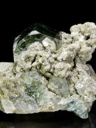 Podložkový kámen, kdy na vrchní části křemenné podložky narůstá velký zelený krystal apatitu.Podložkový kámen, kdy na vrchní části křemenné podložky narůstá velký zelený krystal apatitu. Krystal apatitu dosahuje velikosti 29 mm a je oboustranně ukončený. Krystal apatitu má poškození 13x5 mm, které je zohledněno do ceny vzorku.