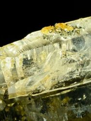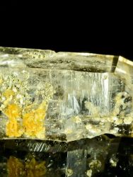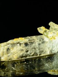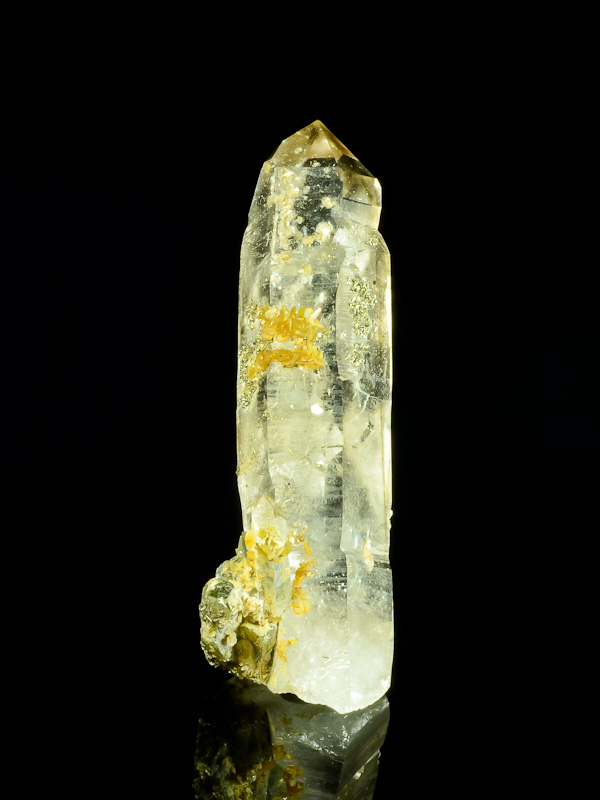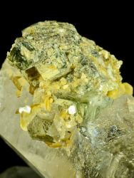 Ukončený krystal křišťálu, pokrytý chalkopyritem, sideritem a několika krystaly apatitu.Ukončený krystal křišťálu, pokrytý chalkopyritem, sideritem a několika krystaly apatitu. Vzorek má příjemnou barvu, vysoký lesk a slušnou čistotu krystalů. Drobné krystaly chalkopyritu a sideritu pokrývají místy tenkou vrstvičkou krystal křišťálu. Největší krystal ukončeného apatitu zelené barvy měří 8,4 mm. Malý, ale velmi slušný zástupce lokality.