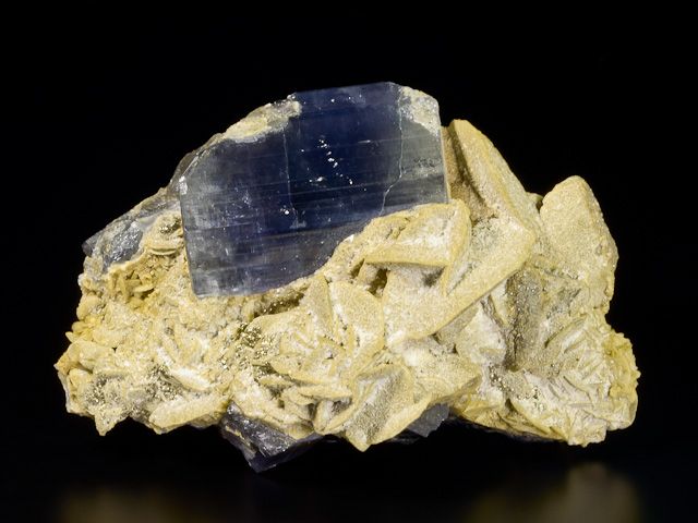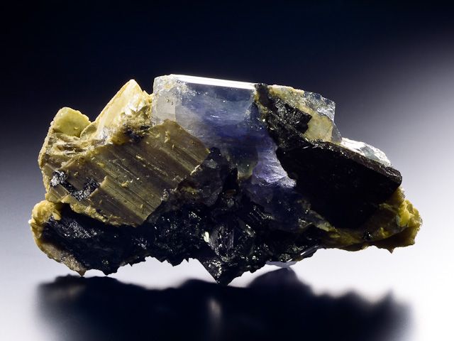 A cluster of intergrown greyish-green-blue, Apatite crystals, to 42 mm, are partially encased in yellowish Siderite and Ferberite crystals.A cluster of intergrown greyish-green-blue, hexagonal Apatite crystals, to 42 mm, are partially encased in yellowish Siderite and Ferberite crystals. The exposed prism faces of the Apatite crystals are very lustrous. Stands well - a good inexpensive example. Most crystals are complete and undamaged, but two main crystals are bruised.