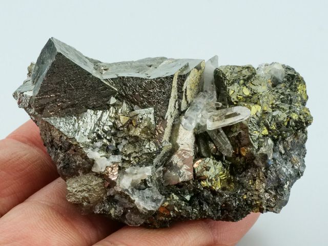 Heavy arsenopyrite crystals with brassy chalcopyrite crystals and quartz. Classic Yaogangxian specimen of great quality.