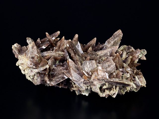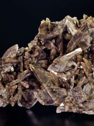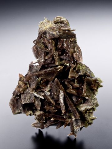 Tmavě hnědé, skelně lesklé, průsvitné, protažené krystaly axinitu dosahující velikosti až 45 mm, které se navzájem prorůstají.Tmavě hnědé, skelně lesklé, průsvitné, protažené krystaly axinitu dosahující velikosti až 45 mm, které se navzájem prorůstají. Na nepohledové straně je axinit v kombinaci s vláknitými krystaly byssolitu. Velký a kvalitní, velmi estetický vzorek z nového nálezu z lokality Canta.
