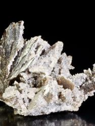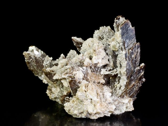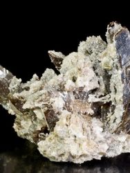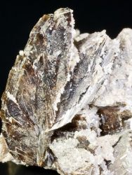 Tmavě hnědé, skelně lesklé, průsvitné, protažené krystaly axinitu dosahující velikosti až 29 mm.Tmavě hnědé, skelně lesklé, průsvitné, protažené krystaly axinitu dosahující velikosti až 29 mm, které se navzájem prorůstají.Malý, ale kvalitní vzorek částečně pokrytý velmi jemným popraškem křemenných krystalů.