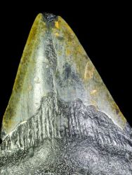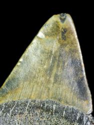 This megalodon shark tooth has a rough dark brown root that contrasts subtly with the smoother, shinier enamel. This grey megalodon shark tooth 67.1 g embodies the quiet power of the ancient creature from which it came.