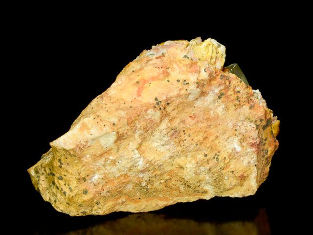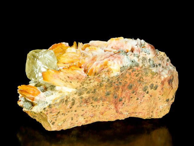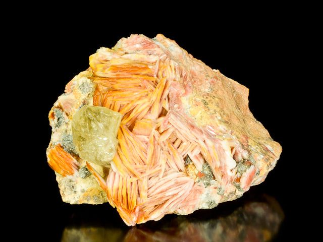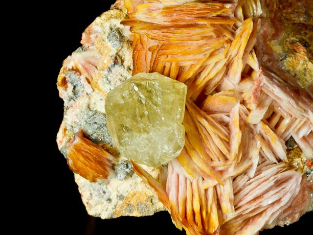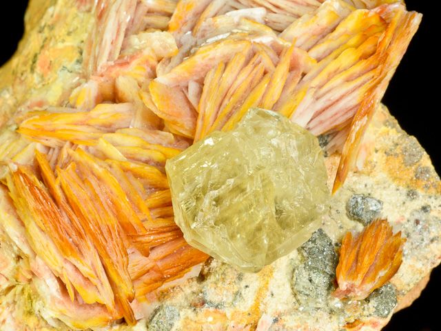 Large transparent yellow cerussite crystal with a few groups of translucent bladed barite crystals.Large (for the locality) transparent yellow cerussite crystal to 24 mm with a few groups of translucent bladed barite crystals to 25 mm. The cerussite crystal is exceptionally lustrous and transparent with deep color. The cerussite crystal have excellent yellow-green fluorescence. No damage.