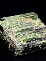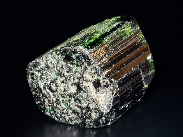 Krásný ukončený krystal chromdravitu z Landanai. Jedná se o turmalín extra tmavé zelené barvy a vysokého lesku. Jeho zabarvení do sytě zelené barvy je způsobeno příměsí chromu a vanadu. Barva chromdravitu je považována za nejintenzivnější zelenou ve světě drahých kamenů.