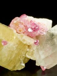 Malý ale kvalitní vzorek danburitu, turmalínu a hambergitu na záhnědě z lokality Malkhan.Malý ale kvalitní vzorek danburitu, turmalínu a hambergitu na záhnědě z lokality Malkhan. Až 5 mm velké krystaly rubelitu na srostlici ukončeného danburitu a záhnědy. Na vzorku je i jeden velmi malý 2,8 mm velký krystal hambergitu přímo nasedající na krystal danburitu. Hambergit je vzácný minerál vyskytující se v drahokamových pegmatitech. Kámen v dobrém stavu vhodný i jako investice - kameny z lokality Malkhan cenově rostou rok od roku raketově vzhůru. Vzorek je velmi křehký - nový majitel bude muset na tuto skutečnost brát zřetel a zacházet tak s ním.