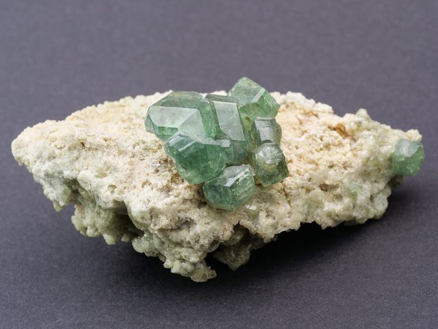 Lustrous transparent green demantoid garnet crystals, the chrome-rich green variety of the mineral species andradite, on one face of contrasting light-colored matrix.Lustrous transparent green demantoid garnet crystals, the chrome-rich green variety of the mineral species andradite, on one face of contrasting light-colored matrix. The demantoid crystals are dodecahedral form, some with trapezohedral edge faces. Small but very nice specimen.