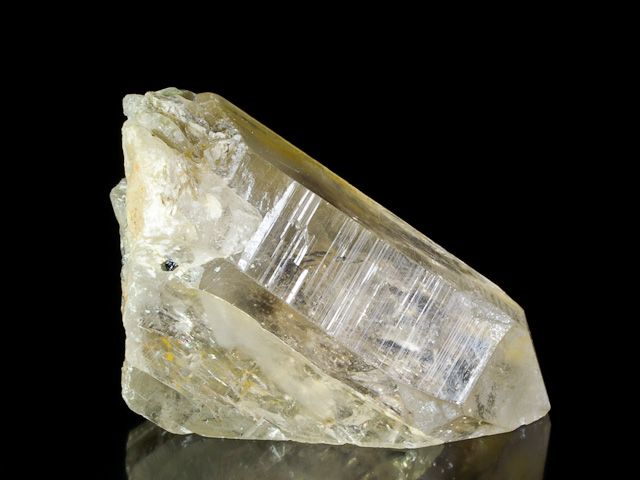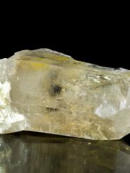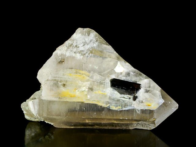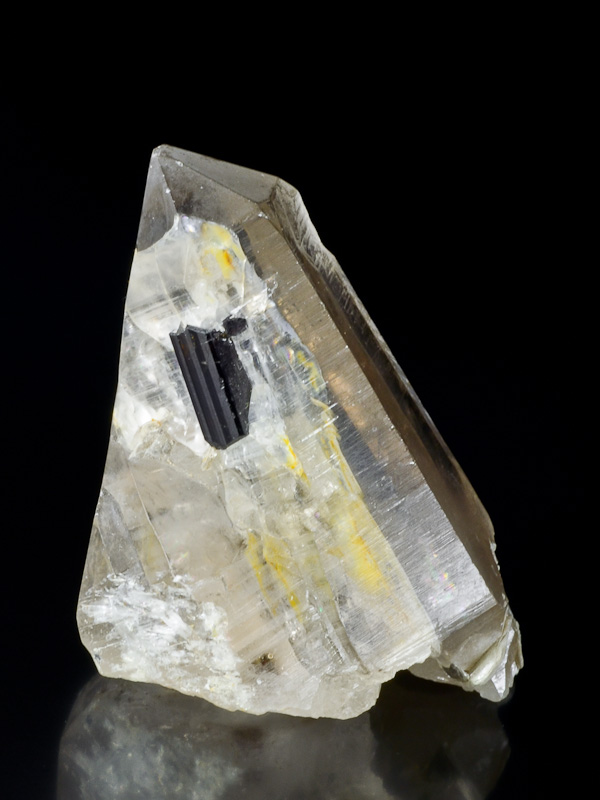 The gem dravite perched in the middle of the quartz is about 1.5 cm, dark but transparent and gemmy.The gem dravite perched in the middle of the quartz is about 1.5 cm, dark but transparent and gemmy. The termination of the quartz crystal is chipped.