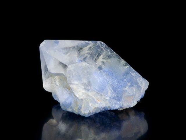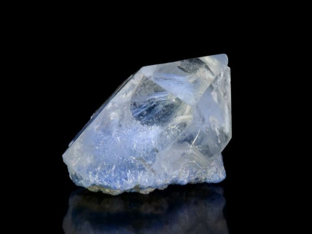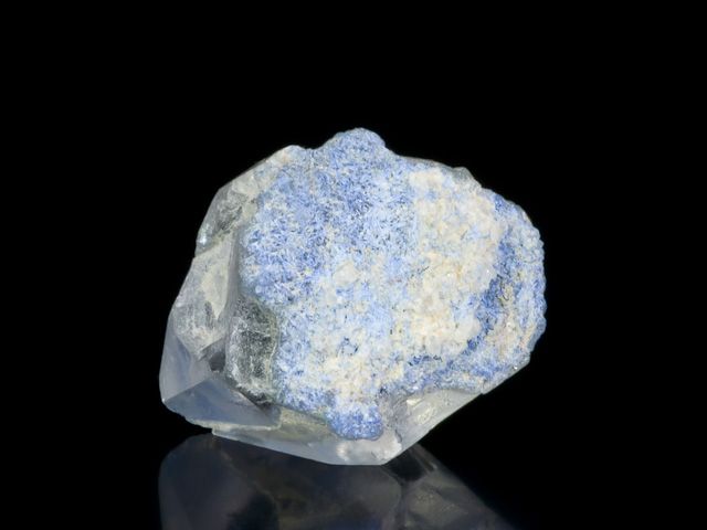 Lesklý krystal křišťálu s hojnými inkluzemi jemných vláskovitých xx dumortieritu.Lesklý krystal křišťálu s hojnými inkluzemi jemných vláskovitých xx dumortieritu výrazně modré barvy. Jen minimální poškození.