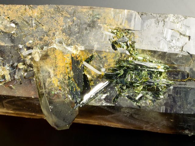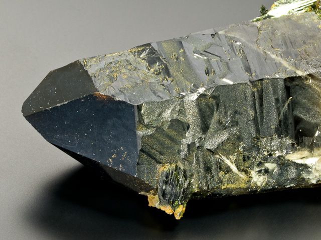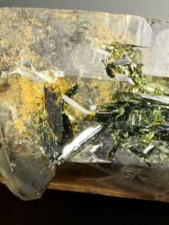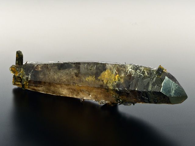 This is a fine example of aegirine crystals protruding from a doubly terminated elongated smoky quartz crystal.Mount Malosa, located in Malawi in southeastern Africa, has produced the world's best crystals of the rare sodiuum pyroxene mineral Aegirine. This is a fine example of aegirine crystals protruding from a doubly terminated elongated smoky quartz crystal, for a very anthropomorphic effect. The locality is presently producing very little of this quality.