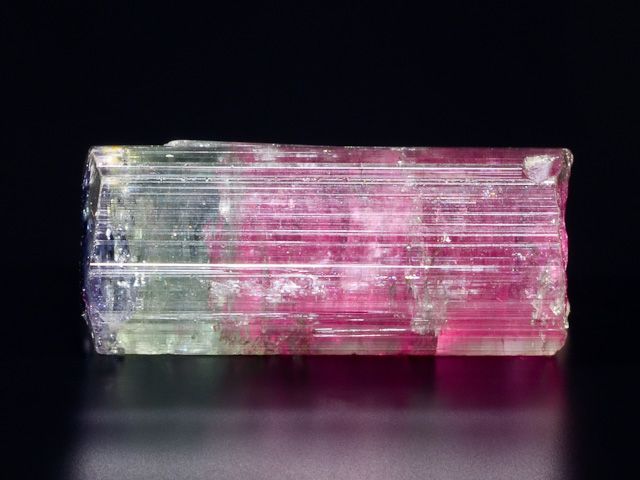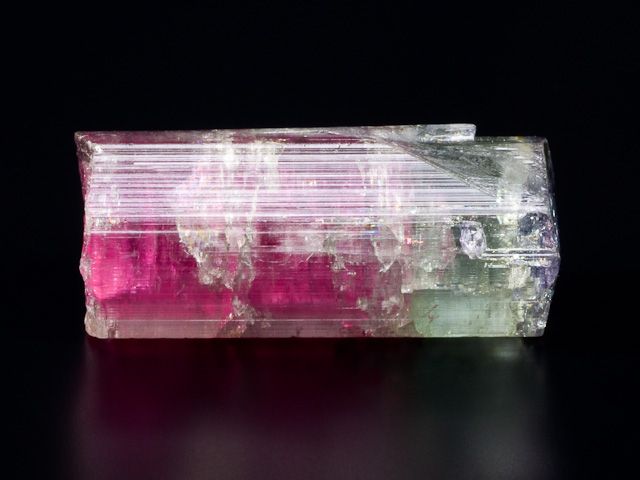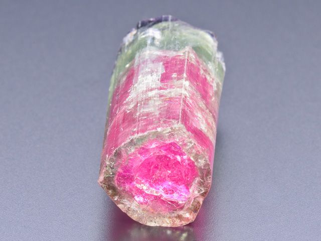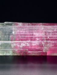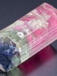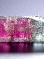 Ukončený krystal elbaitu z významné brazilské lokality Cruzeiro mine. Krystal má jedinečnou světle malinovou barvu v centrální části krystalu, přecházející do zelenomodré barvy na povrchu krystalu (tzv. vodní meloun). Krystal není poškozen. Barva kamene je ve skutečnosti mírně tmavší barvy - toto je způsobeno nasvícením ve studiovém prostředí.