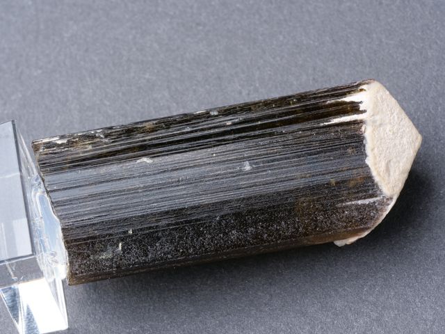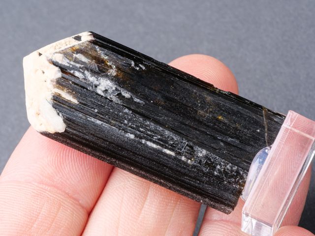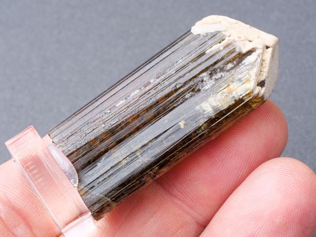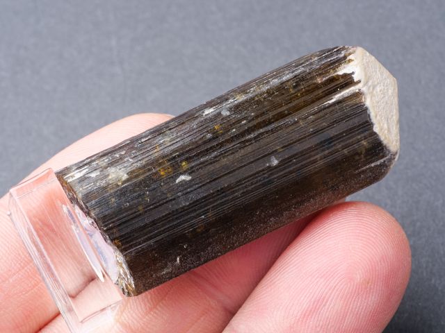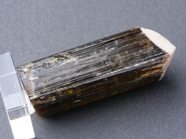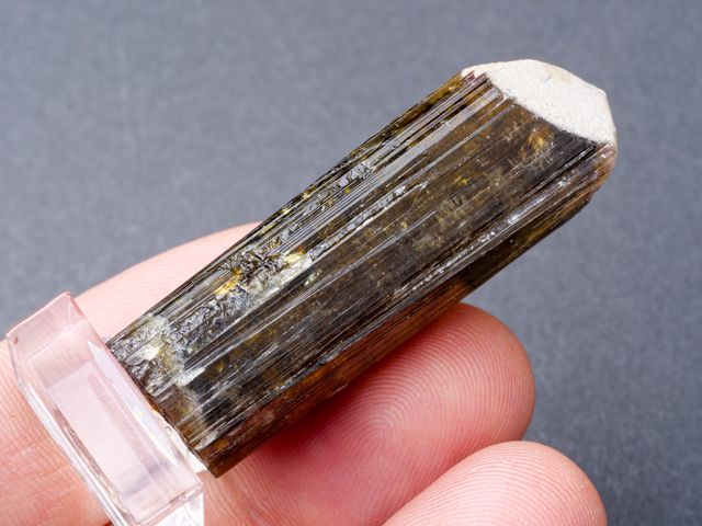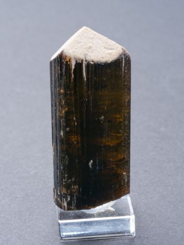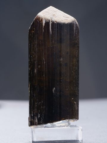 Ukončený krystal elbaitu z famózní lokality Malkhan. Jedná se o turmalín elbaitové řady z pegmatitů Sibiře. Lesklý ukončený krystal bez poškození. Krystal má zelenohnědou barvu místy přecházející do žlutavé barvy a jeho čistota by splňovala kvality suroviny na broušení tzv. ruské "kabošonky" či placiček do šperků. Zajímavá krusta na plochách ukončení.