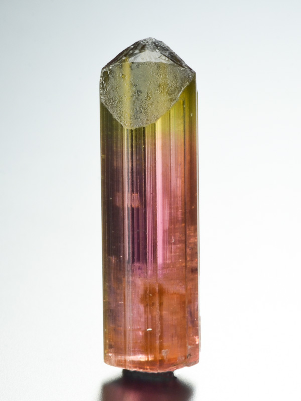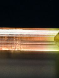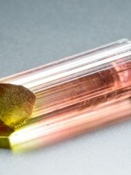 A very nice example of the tourmaline variety elbaite from a find in 1980s. This one is almost pristine and has glassy lustre. Other tourmalines are pink, but few are this pink/yellow. It is complete all around, and very symmetrical.