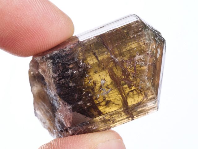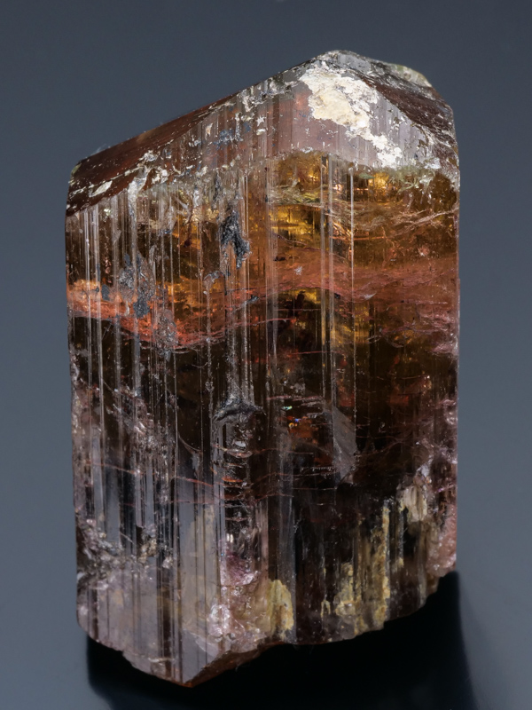 Hezký ukončený krystal elbaitu z relativně nové lokality Goma. Krystal má zelenooranžovou barvu v celém objemu (hezky viditelný dichroismus v polarizovaném světle - při otočení osy krystal nádherně zrudne). Malý, ale sběratelsky zajímavý kámen dobré kvality vhodný teoreticky i do šperku.