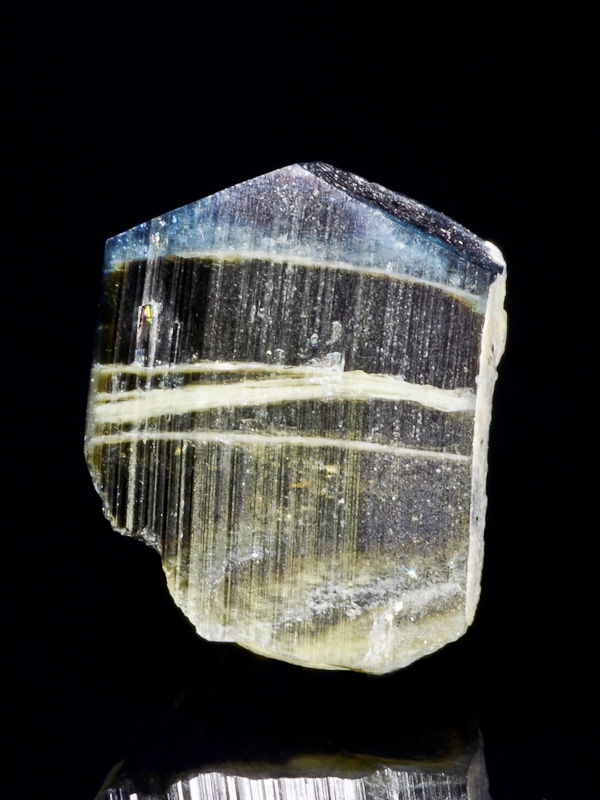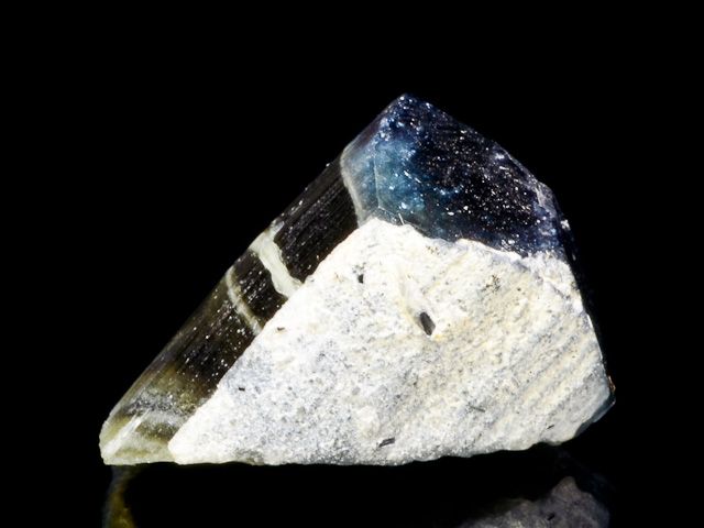 Here's a beautiful specimen of blue/black tourmaline that is black for most of its length, then changes to blue on the termination. An extraordinary example of the species, from a difficult to acquire locality. Undamaged with unbroken termination, however backside has contacting where was a matrix.