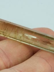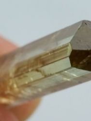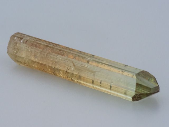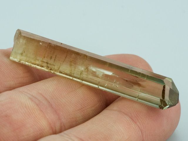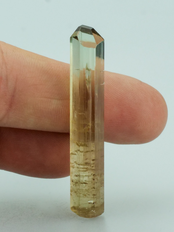 Hezký ukončený krystal elbaitu z relativně nové, ale vytěžené lokality Goma. Krystal má jedinečnou světle růžovou barvu v dolní části krystalu, přecházející přes velmi světle žlutou do pastelově zelené barvy v horní třetině krystalu. Sběratelsky zajímavý kámen dobré kvality vhodný teoreticky i do šperku.